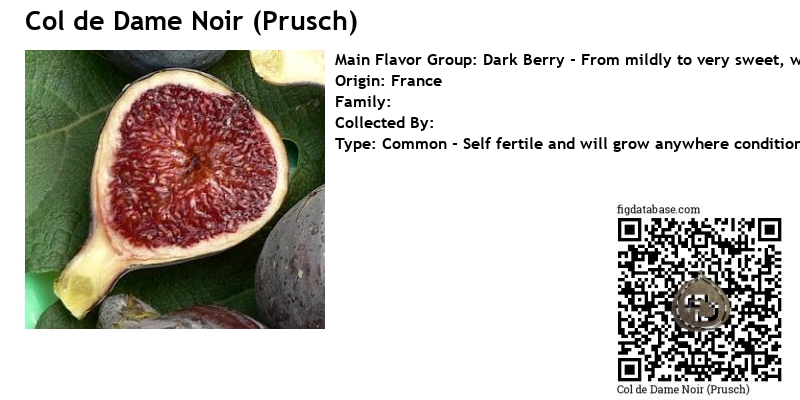 Col DE Dame Noir produces high quality medium sized, dark brown to almost Black colored delicious figs. Thin skin that does not damage easily. Typical Col DE Dame elongated neck. Dark red pulp with the consistency of jam; thick and heavy, not watery at all. Easy to bite into. The white part (meat) can be quite thick. If left to hang on the tree the sugars and pulp will concentrate and you'll get that clear delineation of meat and pulp when it is cut open. This outline is another typical trait of CdD's and add's to the clean look of the fruit. Very complex and rich fig flavor with a medium sweetness and berry undertones that makes you appreciate a good Col DE Dame. Small seed crunch and no cavity. Tight eye. 1 crop. No pollination needed. Great variety for potted culture. Very Hardy tree that needs lots of sun and a longer season than most. Definitely one of the finest tasting figs in the world!