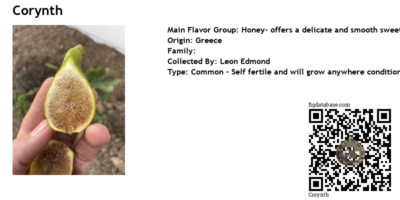 Corynth originates from Peloponnese, Greece and was discovered and introduced by Dr. Leon. Originally named Mykonos, it was shared with the late Hanc Mathies who renamed and shared it with Belleclare Nursery in Plainview, NY. The owners of Belleclare grew Corynth and became as impressed with the newly discovered variety as Dr. Leon and Mr. Mathies. The variety was added to their inventory and became #98 on their sales list. Our mature fig tree was propagated by a Cutting taken from a first generation Corynth which came directly from the now closed Belleclare Nursery in Plainview, Long Island, NY. Belleclare was in business for almost 50 years and was owned and operated by two of the most prominant fig people in the world, Chris and Bill DiPaola. It was home to many wonderful and rare varieties of fig trees. Corynth is one of those trees.
