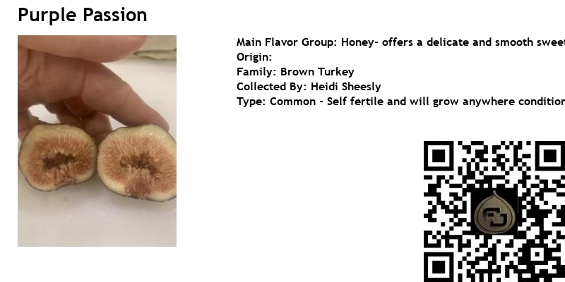 Purple passion is a fig cultivar “discovered” by Heidi Sheesly of TreeSearch Farms in Houston, TX.
