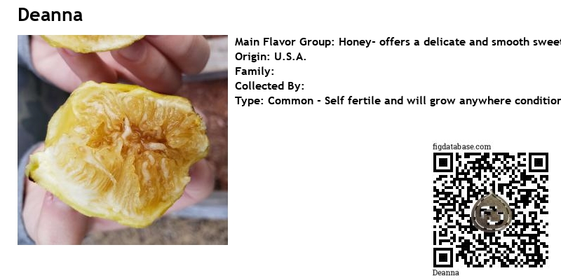 Deanna produces large green figs that ripen to yellow or greenish yellow. The strawberry to amber flesh is considered to be of very good quality. The small eye helps to minimize spoiling. Deanna is another fig that came out of Dr. Ira Condit's breeding program at UC Davis, Riverside. It was developed to replace Calimyrna and it also has good cold hardiness. Deanna is a very large fig with fruits over 100 grams being typical. The fruit has a green exterior and an amber to light red pulp with a sweet taste. It was originally developed as part of Ira Condit's breeding program. It was bred to be resistant to cracking and splitting.