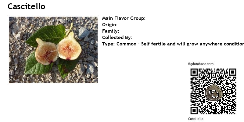 Second-crop figs of two sorts; the caprified, designated as Schiavoni, and the uncaprified, designated as Canibianchi. Schiavoni medium, oblate, depressed at the apex; stalk short; eye rather large, with scales violet; skin checking rather prominently at maturity, readily peeled; color violet- Black ; pulp coral red; seeds fertile. Canibianchi smaller, sometimes not even half the size of the Schiavoni, much lighter in color of skin and pulp; flavor sweet; seeds few. Fruit of Cascitello is mostly consumed fresh, especially the Canibianchi; the Schiavoni are preferred for drying.
