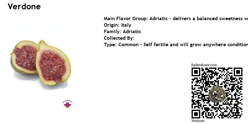 Verdone: (syns. Grosse Verte, Nebian, Adriatic, White Adriatic, Fico di Fragola, Strawberry). Described as Verdone by Gallesio (1817), Gasparrini (1845), and West (1882). Described as Grosse Verte by Audibert Frères (1854) and Barron (1867, 1868a, with outline drawing). Described as Nebian by Hogg (1866), Wright (1894), and E. A. Bunyard (1925). Described as Adriatic by Eisen (1885, 1887, 1888, 1897, 1901), Massey (1893), Forrer (1894), Colby (1894), Earle (1900), Wythes (1902), Starnes (1903), Starnes and Monroe (1907, with figure), Mills (1914), Roeding (1914), Potts (1917), Roberts (1917); Condit (1920d, 1921c, 1923, 1933, 1947), Davis (1928), Burger and DE Wet (1931), Grasovsky and Weitz (1932), and by Woodroof and Bailey (1931). See account and color plate of Adriatic by Lelong (1890) and by Taylor (1898); trees are figured by Condit (1933).