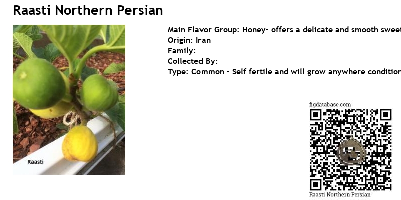 Raasti Northern Persian Unknown (Iranian Candy) was brought to the US by an Iranian immigrant. For me as grown in zone 6a, it one of the earliest figs, ripening in the same range as RdB or Florea. It is a small yellow honey fig, sweet, useful and desirable for the earliness of its season. It has smuch more variability in the size of the figs than any other which I have. My inground plant was able to ripen some figs after die back to ground level (with some winter protection). I am not certain of cold-hardiness yet. So far, I have seen a few brebas, which were not especially good.