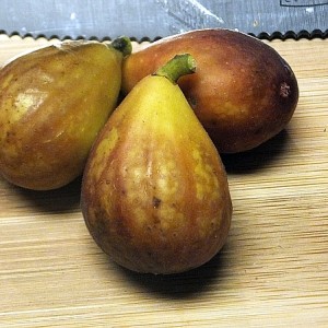 Breba crop small; fruits small to medium, elongated, oblique-pyriform; neck distinct, but merging gradually into the body; stalk up to 1/2 inch long; color green, shading to brown toward the apex; pulp strawberry, somewhat dry and mealy in texture; quality poor.