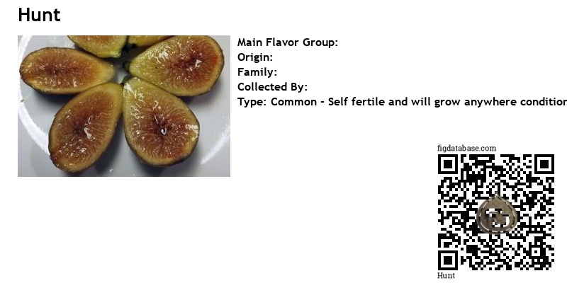 Hunt: A seedling fig developed by B. W. Hunt, Eatonton, Georgia, before 1929, as the result of crossing Ischia Green (Verte) with pollen sent from a Caprifig in California. In this seedling there was realized the objective of producing a fig having a long stalk which would allow the fruit to hang downward, so that water from rain or dew would drain away from the eye. The tree bears a light Breba crop and a heavy Main crop , and in Georgia the figs are Parthenocarpic . In California the tree drops its fruit badly; the variety is therefore incompletely Parthenocarpic . Found only in collections.