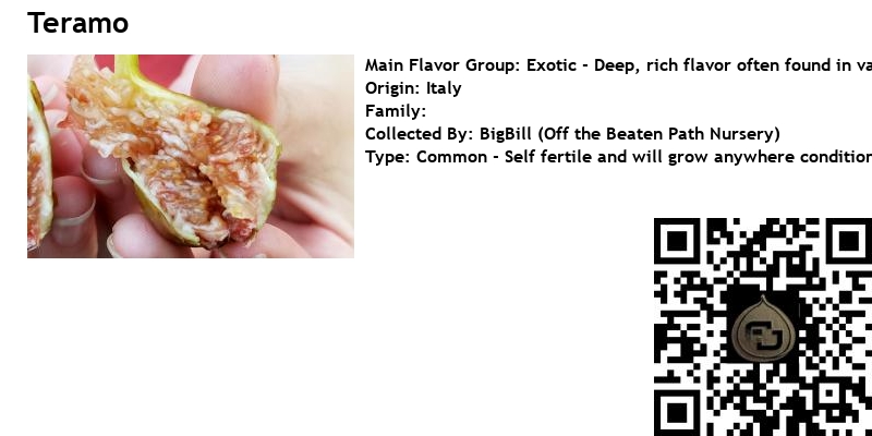 The Teramo fig is a prolific variety originating from the town of Teramo in Abruzzo, Italy. This fig was introduced to the fig community by Bill Lauris of Off the Beaten Path Nursery after it was discovered growing robustly in Easton, Maryland. The Teramo fig is known for its early ripening, producing its Main crop around the same time as other early varieties like Ronde DE Bordeaux and Improved Celeste. It also yields a small Breba crop.