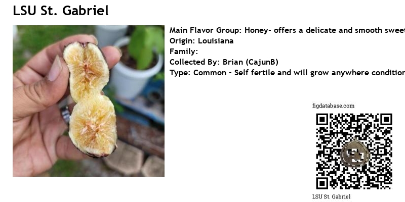 This was the favorite at the Cajun Fig Tasting Tour on 6/5/19........at first taste it went down easily like a fine wine,just the right amount of sweetness and a pleasant jammy taste.I found this fig growing in the LSU orchard in St. Gabriel,LA.