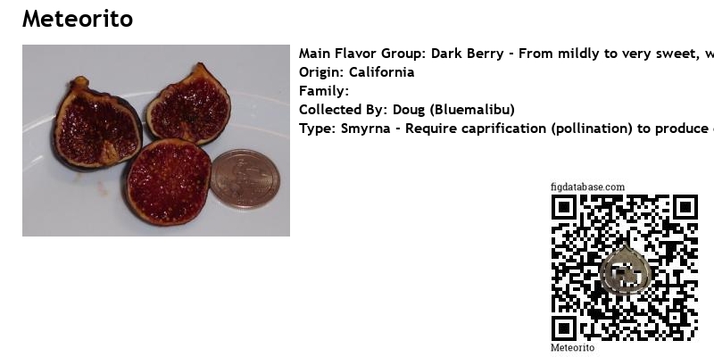 Meteorito is a wild seedling that was discovered near Thermalito, Calif. I believe it to be a Smyrna . The fruit has the flavor and consistancy of Cinnamon-Cherry Jelly Belly candies. I haven't found it to be a real robust growing cultivar without being grafted to diferent rootstock. The mother tree was tiny when I found it in the back-country, and it hasn't put on significant growth over the last three years.