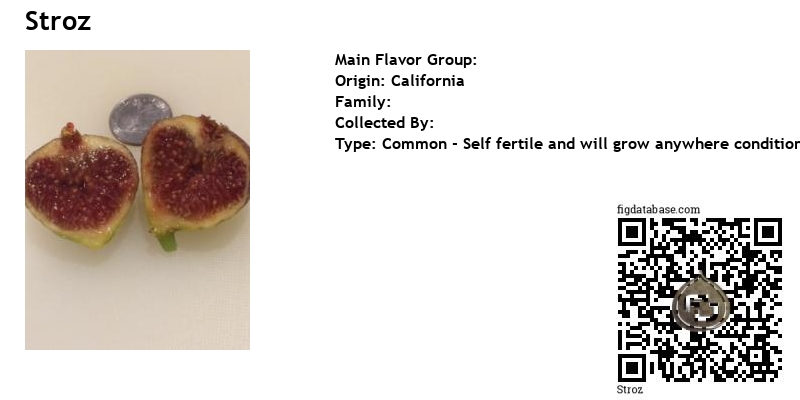 I (Rigo) had the honor of speaking with Deborah for weeks. She told me so much about her find and I quickly found it to be an interesting fig with a unique back story. This variety was a volunteer in Deborah's yard and she has since registered it in 2019 with the California Rare Fruit growers. So far, the Stroz fig has been grown in the west San Fernando Valley and Thousand Oaks of California. I asked her if it was ok if I added the information and images for safe record keeping here on the database and she gave me the green light. The following is the information Deborah provided us all with: