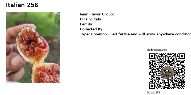 I-258 is a large dark bluish colored fig with a medium to dark red interior. It is a favorite fig among collectors and is similar to Bourjassote Grise, but reportedly sweeter. It produces early and heavily. The fruit is sweet, richly-flavored, and juicy. I-258 is one of a series of Italian figs imported by collected Todd Kennedy from Dr. Grassi. Dr. Grassi had lost his notes so the original names of these Italian varieties have been lost.