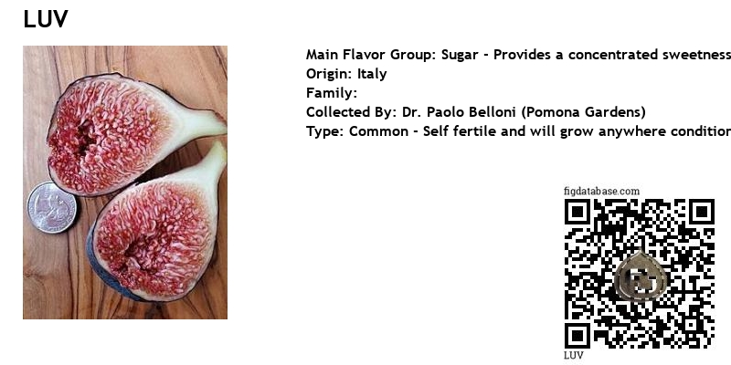 Hello everyone! Hope I can help clarify some questions, my name is Mario Di Natale from Connecticut, I'm pretty sure I'm the only person that Paolo gave the LUV to in US however you could clarify with him. I do not sell fig plants and have no reason to distort the truth , I did give the LUV to 3 different people for donation to Pomona Gardens, Steve Winter from Alpine Texas is one of them, the second one to someone from Maryland and the third from New York and I will not disclose their names unless they tell me to. I do not know too much about it , you can look it up at Pomona Gardens not sure what Paolo has posted, it is very rare , the man he Originally got it from is gone, I posted some pictures on figs4fun unfortunately they're gone, they are not blue like someone's picture .Steve Winter has pictures and probably can tell you more than I can,he seems to be a gentleman . Like I stated I do not sell, but donations to Pomona are welcome.