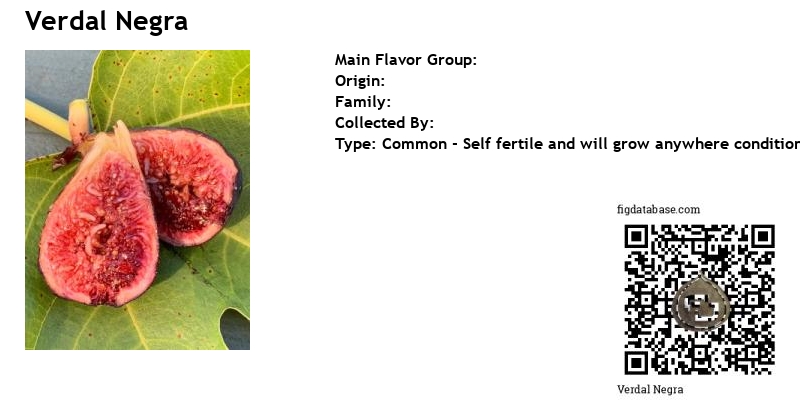 Verdal Negra is a cultivar of fig type Common Fig Ficus carica, unÃfera (with one crop per season, the figs fall) with figs epidermis with color deep Black background, and on Black reddish around the peduncle and of the ostiolus. It is grown in the collection of fig trees of Montserrat Pons i Boscana in Llucmajor (Spain).