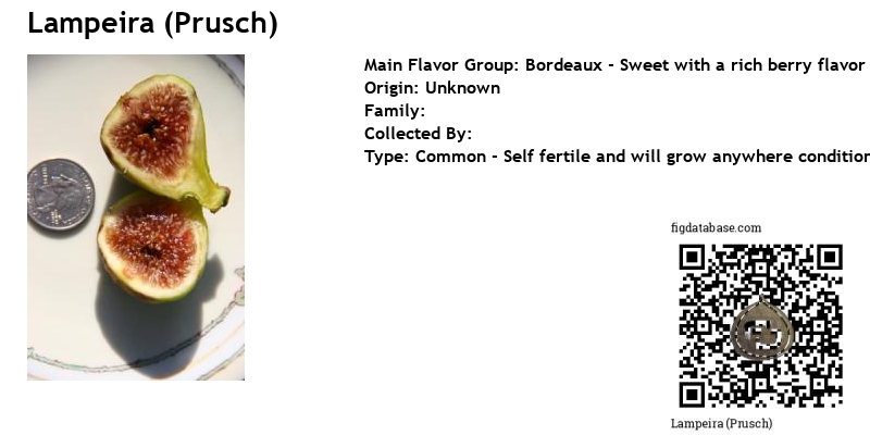 Lampeira (Prusch version) - Fruit is medium to large in size with moderately intense berry flavor, moderate to very sweet, slight acidity, syrupy/jammy texture, moderate seed crunch. Excellent fig. Tree has been a slow grower for us but is now doing well with a good crop in the fifth growing season.