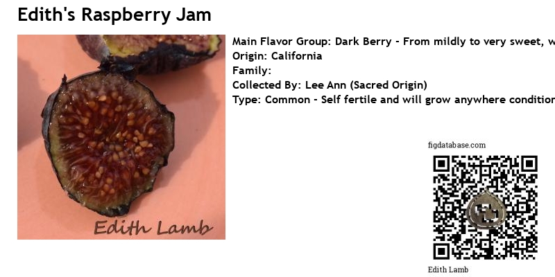 Edith's Raspberry Jam is a fig found in a very remote location of a historic pioneer and mining town. This is a fig that was loved by Edith Lamb as a seedling when she was growing up at around the turn of the 19th century. A Cutting of the mother tree was grown over a memorial plaque that was put in her name near this old homestead in 1990's.