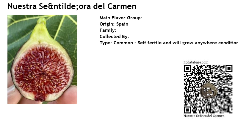 A rare heirloom fig that came from a large botanical garden in Spian. Nuestra Señora del Carmen is an extremely rare cultivar from Spain that produces figs from August to October. It is a common type cultivar with very rich tasty complex flavor. Produces very sweet juicy delicious figs that ripen nicely on it's branches.