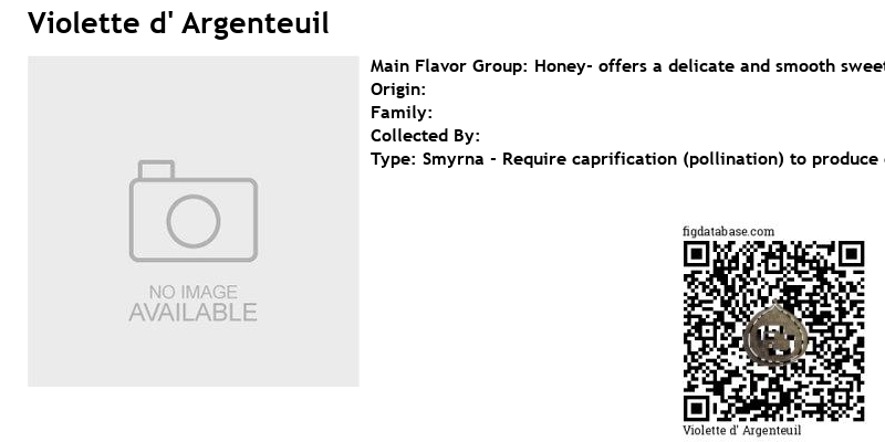 The Violette DE Argenteuil (syn. Grise DE Tarascon) forms a vigorous and productive tree, with spreading habit. This fig is a bifer variety. Producing its figs in early July, very large, pale violet almost gray, with pink flesh, very sweet. The second fruiting takes place at the end of August to September, these 2nd crop figs are half the size of the previous ones, dark brown in color. The flavor and aroma are less, but maintain a very sweet taste of the fig. In less lenient regions only the second fruiting will take place ...