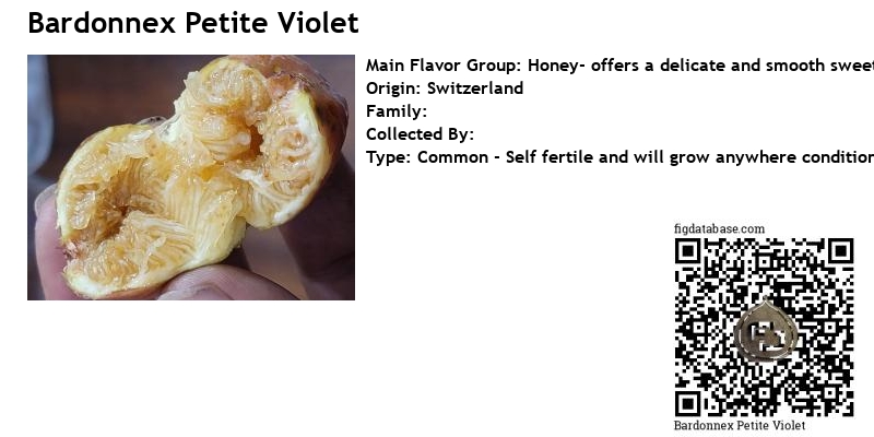 A medium fig with grey to purple skin and pink pulp. It was discovered by a fig collector while visiting Switzerland.