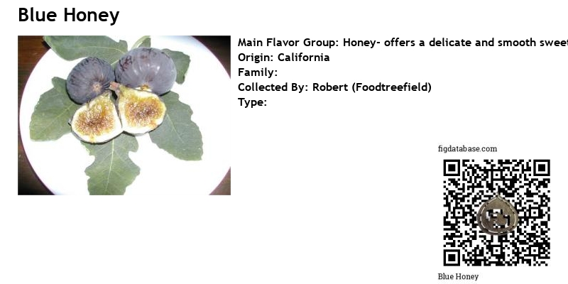Found this one along the River flood-way this summer not far from my home. Found this one by the fragrant fig smell not sight when I was driving by on a hot afternoon. Many visits only yielded a few fruits to sample as the birds and wildlife seemed to keep this tree picked. The fruit has a very sweet taste and beautiful blueish color. It appeares to be common but not proven yet. There is no Wasp activity in this area. Blue Honey should be considered an Unknown and experimental for now. There is a small chance it could be partially San Pedro or Smyna type. No Breba crop observed. The fruit has unique colors unlike anything else I have seen and a refreshing sweet taste.