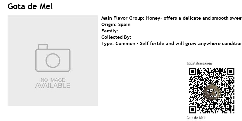 Gota DE Mel: (syn. Gota DE Goma). Names signify “honey-drop” and “gum-drop”; figs when ripening exude a sugary syrup from the eye. This variety, received at Riverside in 1926 from Lérida, Spain, is distinct from Fraga (Col DE Dame) and others in the collection; no description under the above names has been found.