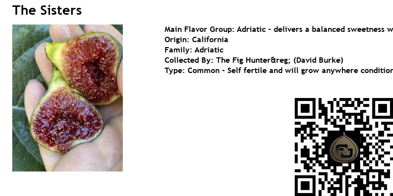 The Sisters fig variety was discovered by David Burke, known as The Fig Hunter, in the mountainous regions of Northern California. This fig is renowned for its mildly sweet flavor with subtle raspberry undertones, making it a delightful addition to any fig collection. The figs are medium-sized, with a delicate, thin skin and a small eye that helps prevent splitting.
