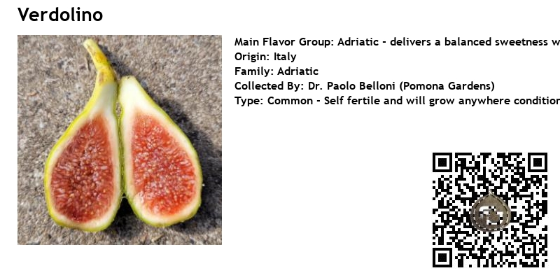 This variety is part of Paolo Belloni's collection at Pomona Gardens in Italy. There was a collector in the US named Mario that introduced this variety to many other growers. Verdolino is a berry fig with an elongated shape that performs well in wet and humid growing conditions. It is also seems to ripen early.