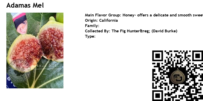 Adamas Mel is a find that we have been following for two years. We were able to pick fruit from the mother tree this year, and they were beautiful. The mother tree grows between oak trees and brush, along a chain link fence and highway. Adamas Mel bears a medium sized fig. It has a thin skin, which is firm but not chewy. Light seed crunch, with a mildly sweet honey flavor.