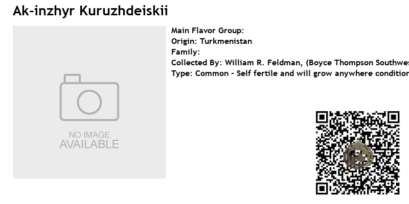 The Ak-inzhyr Kuruzhdeiskii is a fig variety originating from Turkmenistan and collected by William R. Feldman of the Boyce Thompson Southwestern Arboretum. This variety, also known as DFIC 172, is categorized as a common type fig. The figs are typically medium to large in size with a thick and jammy texture, often described as having a sweet berry flavor.