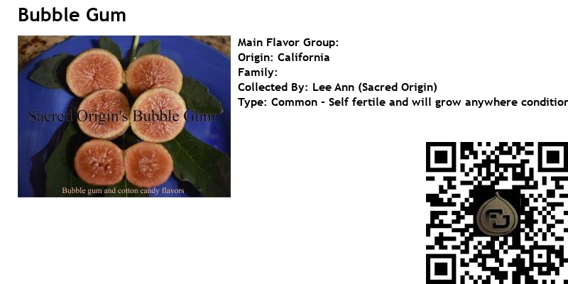 Sacred Origin 's Bubble Gum is a unique seedling found in Northern California . The tree was found under a giant parent tree and dug up by an elderly gentleman who trans-planted it in another part of his yard. The Bubble Gum fig has a unique soft pink exterior with some ribbing and salmon pink interior. Very little seed crunch. The flavors are reminiscent of classic bubble gum and cotton candy. Mouthwatering, delicious and unique flavor profile. The eyes are closed. Productive Breba crop and Main crop . The skin is slightly chewy.