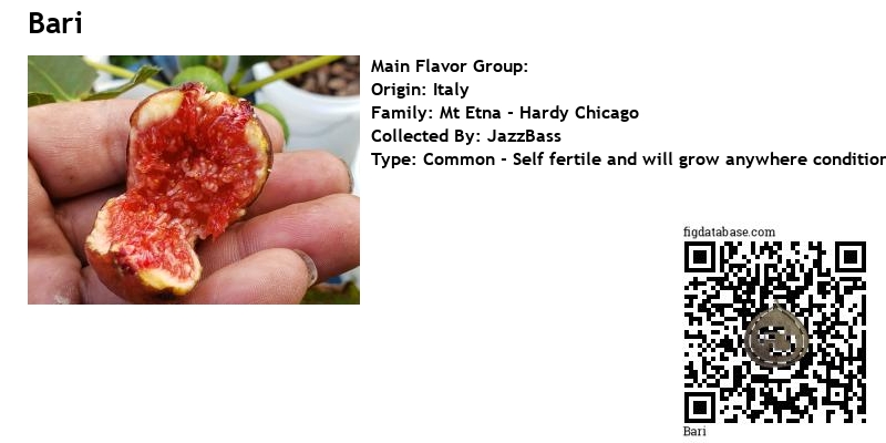 Cold Hardy ! The Bari fig variety is a Mount Etna type fig originating from Bari, Italy and brought to the US by a member of the Armed Forces. It has ties to the Willow Grove Naval Air Base located in Pennsylvania. Shows extreme cold hardiness. Discovered in Willow Grove, Pennsylvania. Although the mother tree was reportedly never protected, it has survived many zone 7 Pennsylvania winters, showing its hardiness.