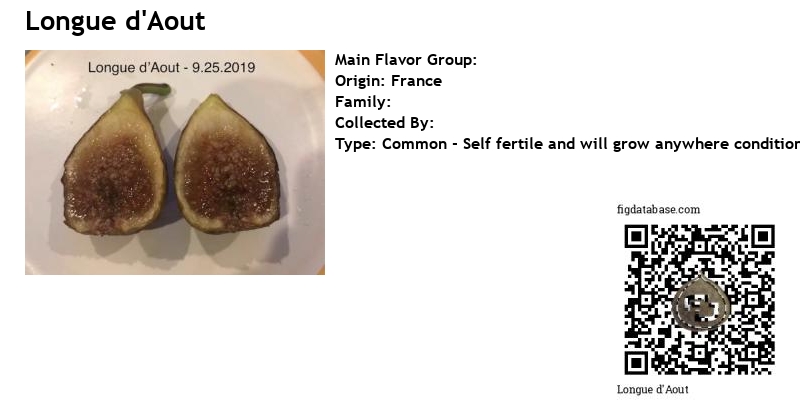 "Let's talk about another great variety that doesn't get too much press, Longue d'Aout. Likely the hardiest French fig, up there with Ronde de Bordeaux, it's name translates to 'Long of August'. Reportedly it was planted at Versailles in the 1700's, so it has been around for a very long time.It sets a unique breba crop. The fruits are very large and long, similar to a banana with a light red interior that ripen in July. The brebas are not very good quality, unfortunately. The main crop figs are not as large, they are round but still of good size with good flavor and sweetness. Main crop ripens end of August through October.