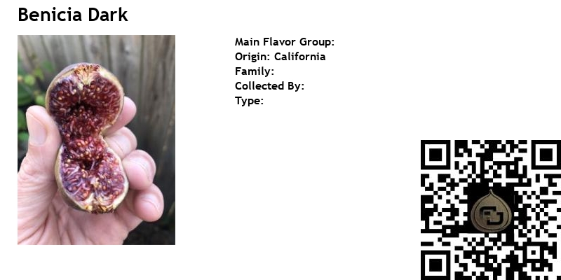 The Benicia Dark fig, also known as Benicia Dark Unknown , is a fig variety discovered in Benicia, California. Growers have reported that the tree thrives well and produces delicious fruits that tend to ripen within a relatively short period, with many figs maturing around the same time.