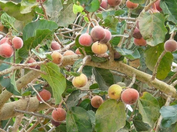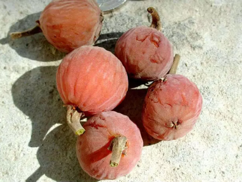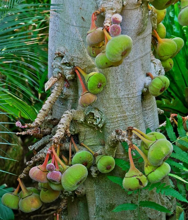 The Sycamore fig ( Ficus sycomorus ) is an ancient fig species native to parts of Africa and the Middle East and was one of the earliest fruit trees cultivated by humans. Unlike the Common Fig (Ficus carica), which produces fruit on branches, the sycamore fig produces clusters of figs directly from the trunk and large limbs in a growth habit known as Cauliflory . The fruits are typically small to medium in size, round, and yellow-green to reddish when ripe. Their interior pulp is pale pink to orange with a mild sweetness and slightly fibrous texture.