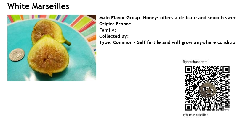 Acquiring an actual White Marseille fig takes a little work. The name White Marseille is a trigger to be cautious in buying as thousands of the fig Tena have been erroneously sold as White Marseille for years, Tena is easily ID'ed as it has a leaf with 5 long fingers. Not even similar to a true White Marseille leaf. I have correctly relabeled my so called "White Marseille" as Tena and one labeled as a Lattarula and a true White Marseille to Blanche. Try to locate cuttings or plants grown from proven plants. Almost all fig trees in the commercial retail markets are Tissue Culture (T/C) produced plants and the primary vendors of the mismarked Tena plants. I would pass on those labeled White Marseille and buy from an individual as a Lattarula or even a T/C plant labeled Lattarulla as it has proven to be correct. -jmrtsus
