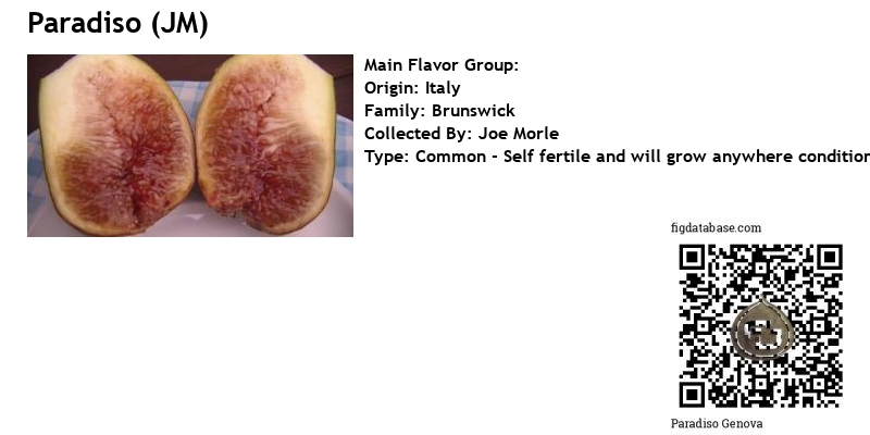 " The name Paradiso Fig originated from a tale about an old man in Italy that sat under his fig tree every morning eating figs and bread for breakfast. People passing would ask him if he was alright and his reply was, "This is my Paradise (Paradiso)." Genova Fig originates from the Northern Mediterranean, in Genova City. This plant yields an abundant amount of large fruit. The first crop is a fist size fruit, long shaped with white/golden skin and pink flesh. It is very sweet and juicy. Leaves are shaped like the palm of a hand. This plant bears two crops in August and September, Lowest zone is 5 and 6. "