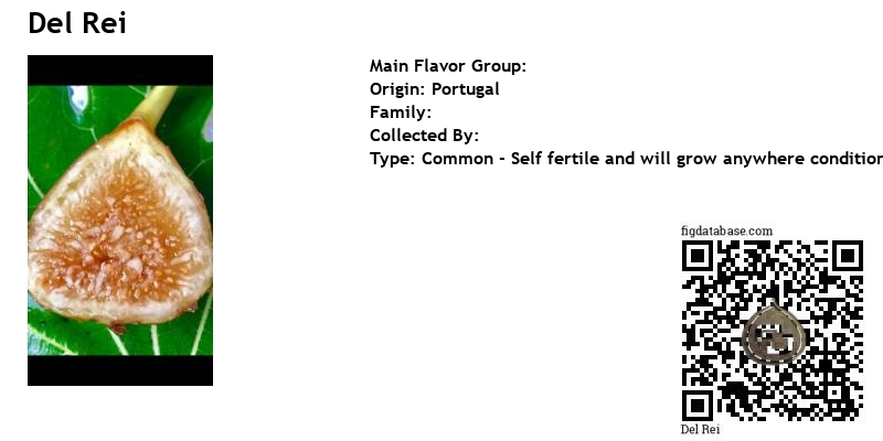 The fruit size is pretty big this is variety, from Portugal. Del Rei is pretty compatible with warm, humid climates. Very productive and a great variety for fresh fruit production. The skin color is dark and the flesh is a golden honey or amber color.