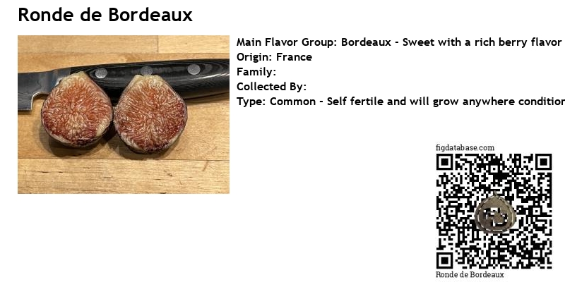 DFIC 229. French origins. Name translates to 'round of Bordeaux' , a self-descriptor, as this fig is small and quite round, from the Bordeaux region.