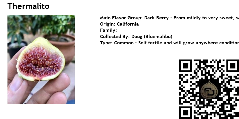 Thermalito is a highly sought after variety. It is a rare fig that originated from the collection of fig-enthusiast, Blue Malibu. It is said that the variety was discovered in California on a 47-acre replica of an Italian Garden, complete with many figs, olive trees, and grapes vines. The horticultural spectacle, created in the 1800s by Americo Ghianda, has since fallen into disrepair, but wild figs continue to grow there.