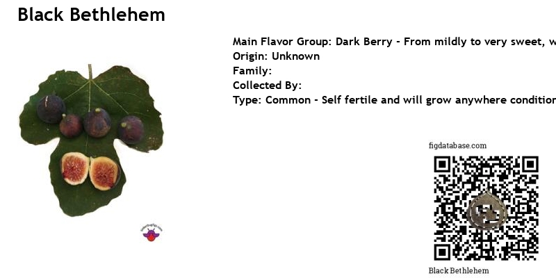 Black Bethlehem is originally from Bass of Trees Of Joy and was discovered in Bethlehem Pennsylvania, which is zone 6b. The mother tree is never protected but rarely dies back and fruits well every year. It is a very cold Hardy fig. The fruit ripens early to mid-season and is small to medium in size. It is a dark fig with a dark interior. It is thought to have originated in Greece.