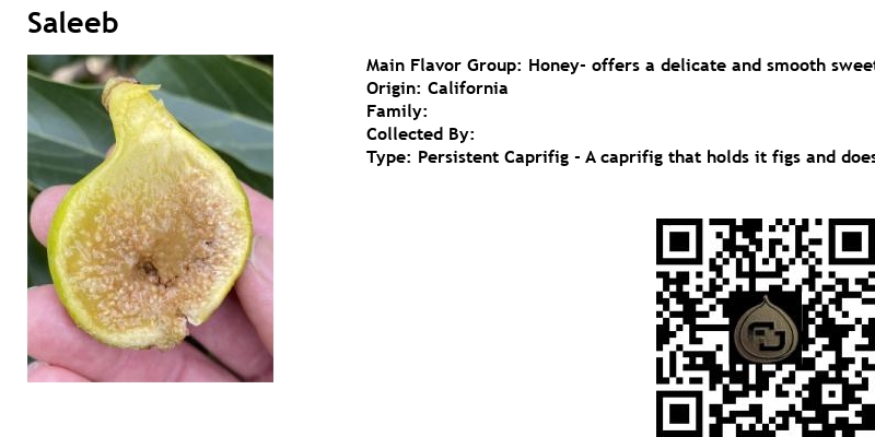 Saleeb, also know as UCR -271-1 and DFIC 10, is a Persistent Caprifig developed and used in the University of California fig breeding program. It reliably produces Profichi (without needing the fig Wasp ) that contain ample pollen (shown in one of my photos). It also produces edible, though not very special, honey figs in the Mammoni crop (those dont have pollen, only the Profichi crop does). If you wanthand pollinate figs, this is an ideal fig. Since it has the Persistent Gene , it is also an ideal part of a breeding program for creating new varieties of common figs, i.e., figs that dont require pollination.