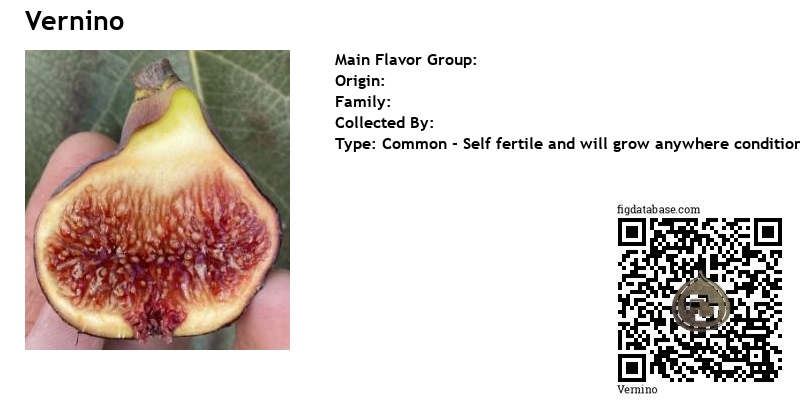 Vernino (syns. Natalino Nero, Pasquale, Camaldolese, Della Cava, Tre Volte l'Anno, Verneo Nero, Arneo Nero, Allison). Described by Gasparrini (1845), Savastano (1885), Eisen (1888, 1901), Vallese (1909), DE Rosa (1911), and Condit (1947). Leaves and fruit figured by Vallese, who treated Arneo Nero and Verneo Nero as distinct kinds; DE Rosa described the two as synonymous. In his account of 1845, Gasparrini listed this variety as Vernino, but added that some called it Natalino, or Christmas fig; others called it Pasquale, since the fruits sometimes remained on the tree during the winter and matured near Pasqua, or Easter. The name Tre Volte l'Anno refers to the tendency of Vernino to produce fruit at various times of the year. Trees usually produce a second crop only, late in the season.