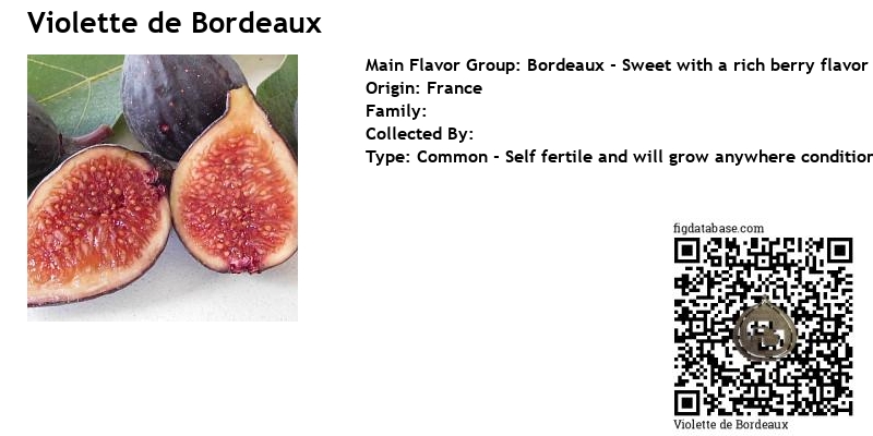 Two regions of France are associated with this variety, each seemingly disclaiming to be its homeland. In Provence, this variety is known as Violette DE Bordeaux, while in the southwest of France, it is called Figue DE Marseille! To further complicate matters, there exists at Aix-en-Provence a very nearly resemblng variety, 'Negronne.' Whether the figs sold in the Pacific Northwest under this name are the true Negronne or Violet DE Bordeaux is unsettled, but the fruits are much alike.