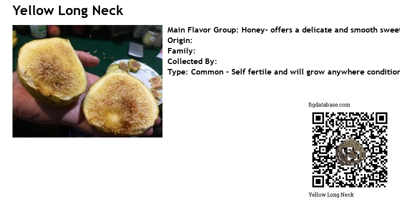 "Is it a long-neck fig that's yellow, or a yellow fig that has a long neck?" This is the question once proposed by long-time Figaholic Harvey Correia with regard to the Yellow Long Neck fig. Apparently it was once called Long Neck Yellow, but through an innocuous change of adjective-noun placement, it became the YLN. This fig was, according to fig legend, acquired at the eleventh hour by the late George Emerich just moments prior to the UC Riverside collection being culled, and all of figdom rejoiced.