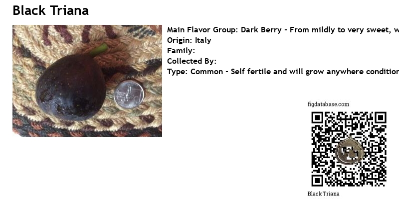A medium to large dark fig, very sweet when ripe. Can have 'honey' in the center. May be part of the Columbaro Nero group of figs, along with Aldo's, Palermo Red, Sicilian Red and others. Splits badly with rain.