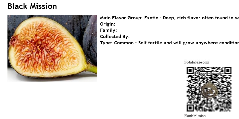 California Rare Fruit Growers, Vol. 23, No. 6, December 1991: Medium, Black skin, reddish pulp. Used fresh and dried. Has strong fig flavor. Good at coast. Has both a Breba and a second crop. Oldest California fig, originally from Spain. Info. from Commercial Dried Fig Production in California, University of California, Leaflet 21051, p. 6, November 1978: Mission came to California from Spain. Tree reaches a larger size than most varieties. It produces both Breba and second crops. Fruits of the Breba crops are large, and many are shipped to the fresh market. Some Breba figs are dried, but their shape relegates this fruit to manufactureing stock. Second-crop figs are much more numerous, smaller, and rounder. Fruits are marketed as whole figs, fig paste, and juice. Leafs out about 7 days after Adriatic. The Breba crop matures before most other varieties, in mid-August to early September. Fruit splitting is minimal, and the eye is fairly tight, so fruit spoilage is seldom a problem.