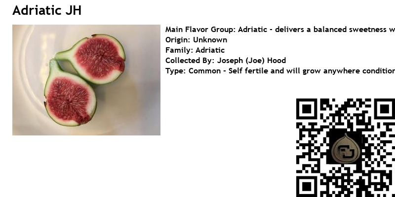 Originally propagated by Joseph (Joe) Hood of Austin, Texas—whose initials " JH " became associated with this selection—it likely originated from a Mother Adriatic tree on his property before being shared with fellow growers. Trees of Joy confirms the name stems from Joe Hood.