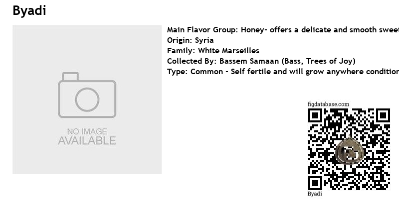 Sourced from Bill who got it from Bass. I spoken to Bass, he told me he has several Byadi Figs. The word "Byadi" means "White Fig" in Arabic. He names it based on where he got it from. This particular fig was from Syria. The flavor of this fig is very similar to what is common here in the US known as White Marsailles aka Italian Honey Fig. The leaves of Syrian Byadi are different, the fruit has a softer texture less seedy. This is a common fig that does not need wasp. Very productive at a young age.