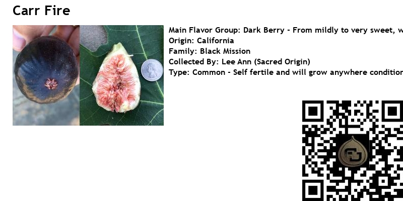 The Carr Fire fig was discovered by Lee Ann , also known as SacredOrigin, in 2018 in California following the devastating Carr Fire, which burned over 200,000 acres and destroyed more than 1,000 homes. This resilient fig tree, which was partially burned and heavily pruned by firefighters, managed to survive and thrive, becoming a symbol of strength and recovery.