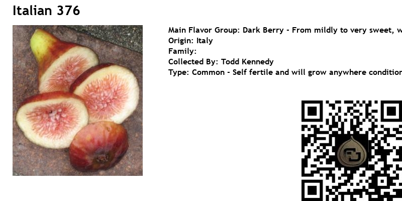 Italian 376 has been described as having a good berry flavor. They’re sweet, but not too sweet. Italian 376 trees will produce drop shaped figs and mostly 5-lobed leaves. The variety produces both a Breba and a Main crop . Italian 376 is sometimes shortened to I-376. The fig was one of the varieties originally collected by Todd Kennedy in 1980s Rome. The numbered series of figs has become available in the U.S. since Kennedy’s collection.